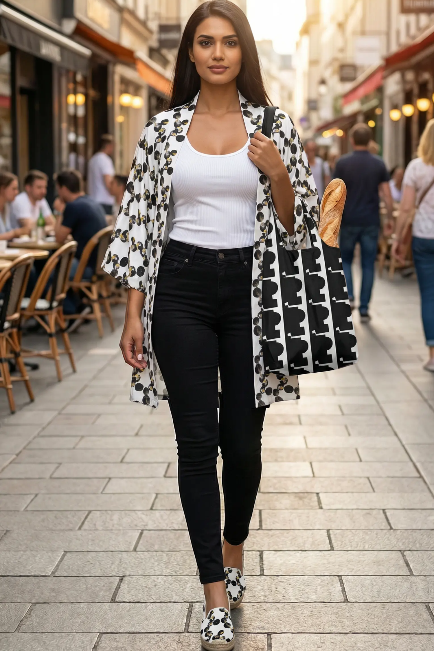 The Layered Noir look shows how monochrome pieces can be styled together for an effortless, everyday outfit. The Black Marbles Kimono is worn open and unfastened, making it easy to layer over simple tops or dresses while adding interest and coverage. It’s paired with Black Marbles espadrilles for comfortable, all-day wear and finished with the Black Solitude Shopping Tote Bag, which adds a practical yet polished touch. This look works well for casual days, travel, or relaxed city styling where you want an outfit that feels coordinated without being overdone.