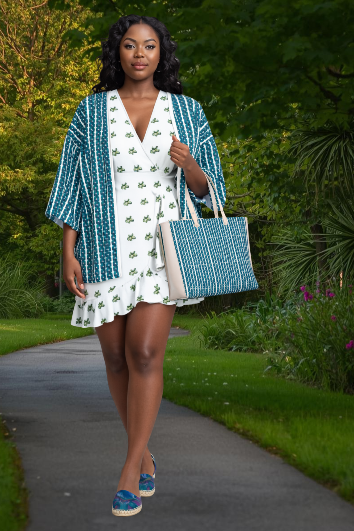 Our Botanical Charm look is an effortless expression of nature-inspired elegance. Featuring a flowing Botanical Kimono Jacket, worn open and unfastened to drape softly over the outfit, this look is styled with a coordinating handbag and espadrilles for a relaxed yet elevated finish. The botanical design brings depth and artistry, while the fluid kimono silhouette adds movement and ease. Ideal for refined everyday dressing, creative styling or laid-back resort moments, the Botanical Look is designed to feel calm, confident and naturally sophisticated.